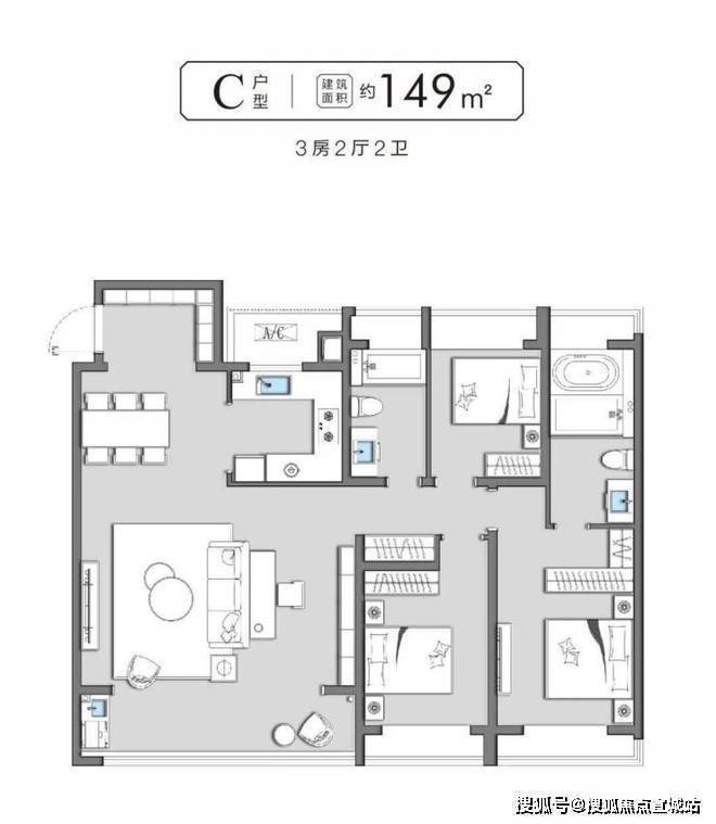 主力户型:建面约105㎡、138㎡、149㎡、151㎡的三至四房。