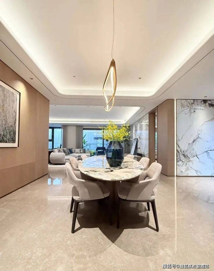 比起中规中矩的直线,弧形施工工艺更复杂、造价更高,却多了几分灵动轻盈!这种弧形的元素不只是在样板间里,在售楼处也能经常看到,比如电梯厅。