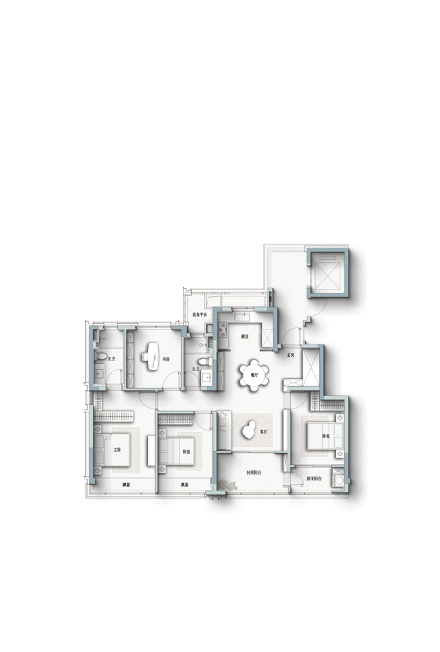 步入室内, 约13.8米南向四开间引光入室,温暖流转每一处角落; LDKB一体化构建出开阔包容的家庭核心区,承载欢聚;与之相连的 自定义X空间,超越了功能边界,化为生活的延伸,无论是茶室、瑜伽区,或是孩子的课堂,皆可随心定义; 约3.6米奢阔主卧成就私享的舒适天地; 大四房格局,灵活应对家庭全生命周期的成长需求。