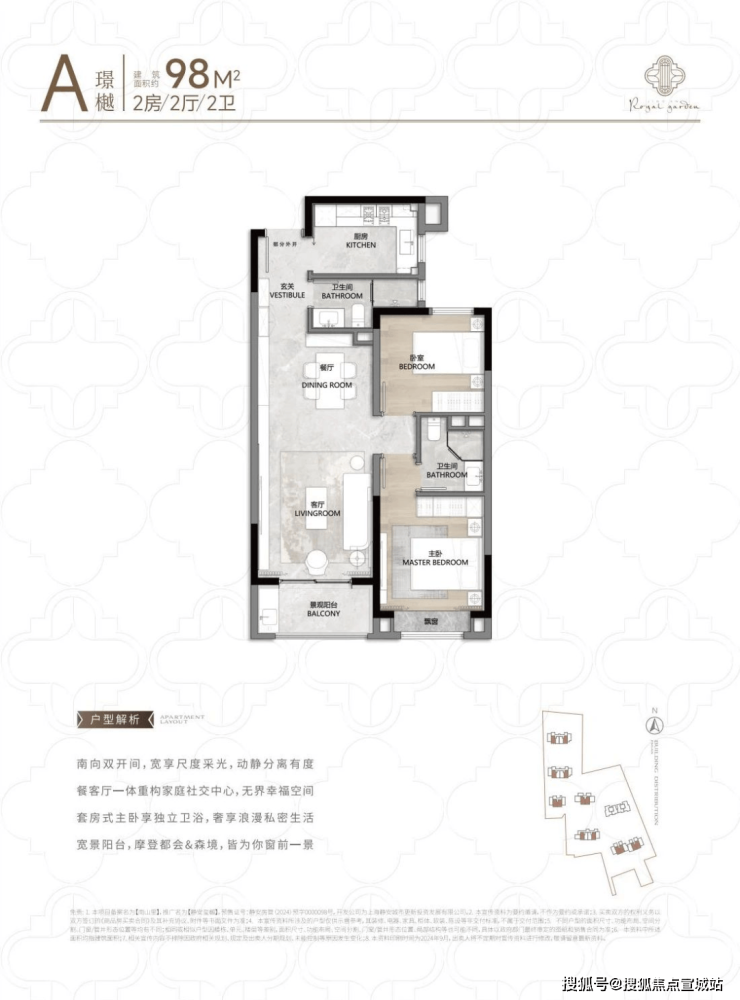 该户型多为楼栋的边套,是一个观景户型。客厅连接270°阳台,视野出众。双卧朝南,阳光满溢。从次卫布局看,如果家庭人口较少,该户型还能做成双套卧。