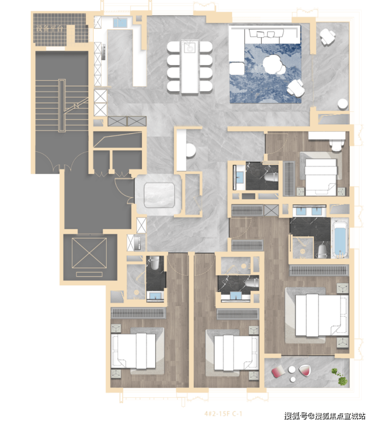 因为寸土寸金,市中心项目不会有太集中的中心景观。而海玥黄浦源,因地制宜进行“一星四叶”的建筑排布,围合出了市心少见的约3000㎡集中景观。