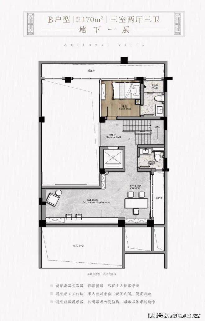 项目地下空间挑高约5.9米,器宇轩昂,至少两个宽屏采光井直通而下,落地空间更大,室内可以最大程度向自然打开。