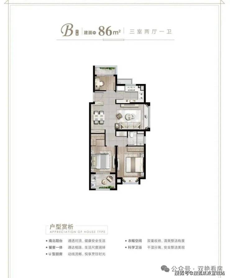 ①86平(三室两厅一卫) 边套户型,三面采光