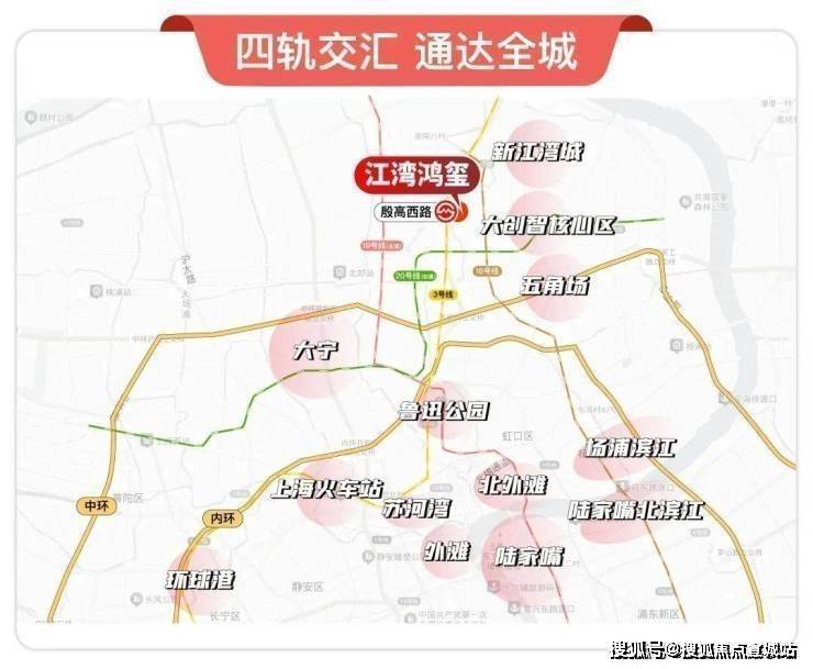 交通配套:步行约 10 分钟可达地铁 3 号线殷高西路站,步行 10 分钟可达在建的 18 号线殷高路站。此外,已开通的轨道交通 3 号线江湾镇站与 18 号线长江南路站也距离项目不远,未来 19 号线(延伸段)和 20 号线将在此交汇。自驾 15 分钟可达五角场,30 分钟可贯通人民广场、陆家嘴。