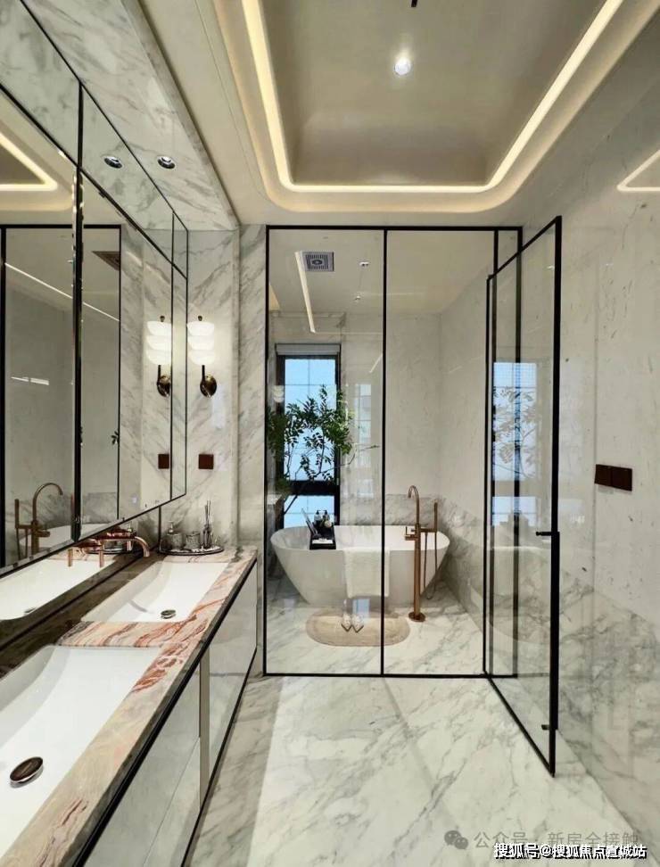 高层住宅的外立面,采用了大面玻璃幕墙,香槟金色和深灰色的铝板的结合,那种独特的“帽子”式塔冠设计,让建筑在天空中拥有极高的辨识度。它不像某些豪宅那样金光闪闪,而是有一种哑光的质感,更耐脏,也更耐看。