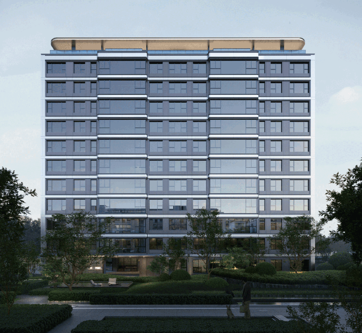 全铝板立面:四面干挂铝板+60%窗墙比,首创“油画框式”鎏光白金立面,搭配防火玻璃落地窗