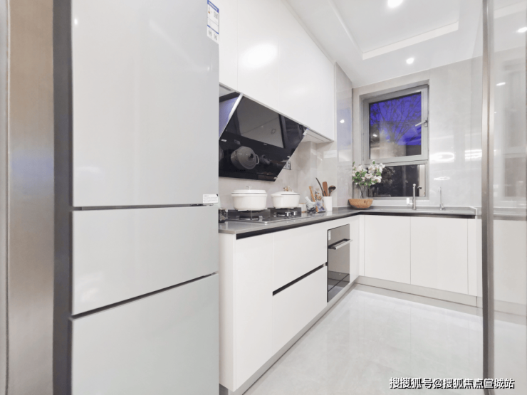 厨房采用了老板油烟机、灶台、洗碗机,海德泰克净水器,松下凉霸,厨柜组合。