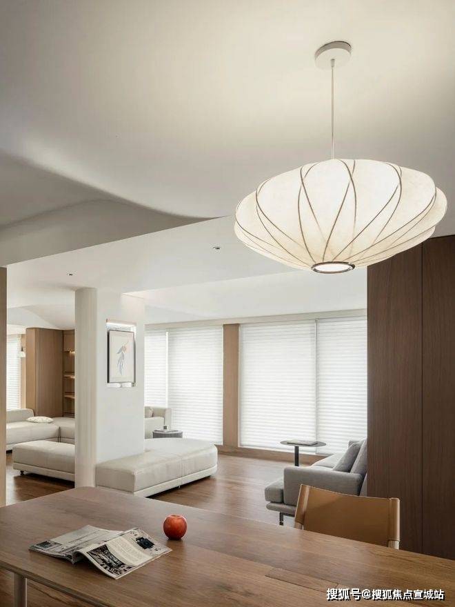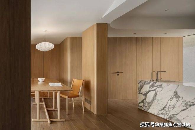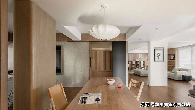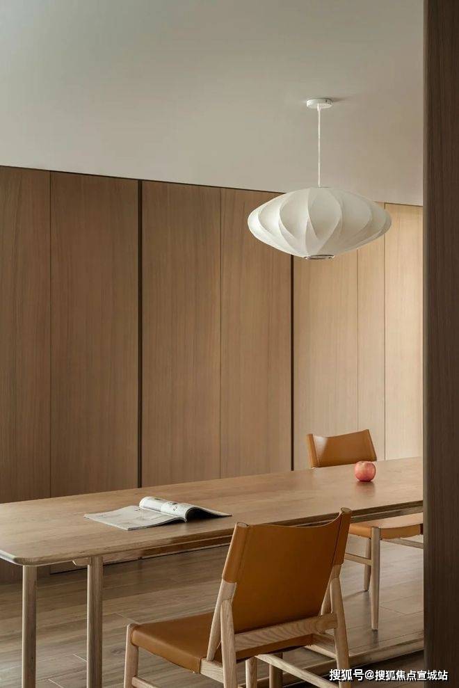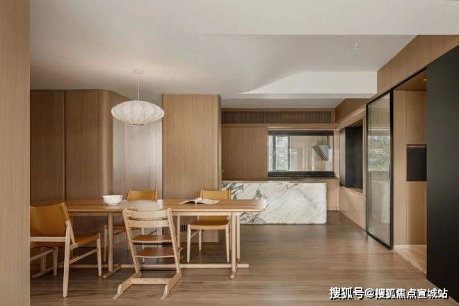 由玄关进入,是一个会客厅与餐厨空间共融的大开间。不同功能区域之间,既没有物理意义上的阻隔,但各自具备场景的围合感。在既定的生活样板之外,更多元的日常被允许自然发生。