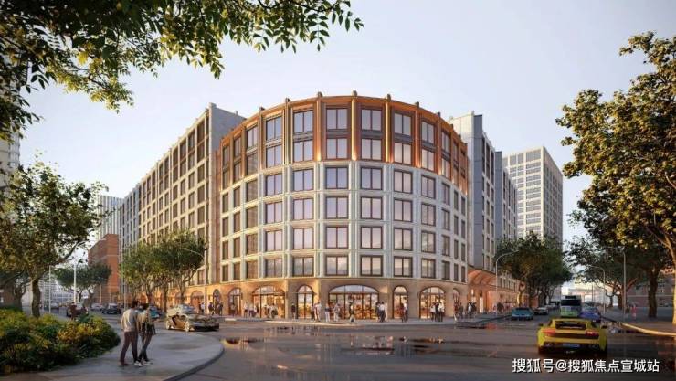 项目的风貌高层保留了古典建筑的三段式立面,基座的连续拱券以及头部的柱头,无疑是历史留下的印迹。而当代材料工艺的引进,则让建筑的美有了更丰富的层次。在高层的底层商业部分,项目选用了来自巴西的奢石波多尔红,搭配高难度的双曲面工艺,呈现出独特的优雅与魅力。商业以上的建筑立面,用巴西进口玫瑰金麻造型石材搭配局部铝板及金属线条,强化了现代感,传递出新旧交融的气质。