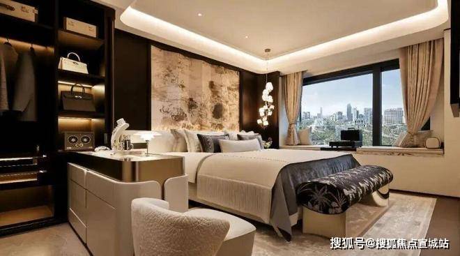 主卧背景墙:黄渊青的拍卖级定制款艺术画,与木饰面拼接,为休憩空间注入“静谧艺术灵韵”。