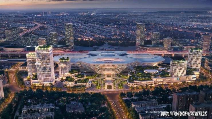 高铁宝山站枢纽总建筑面积约48万平方米。其中,站前广场建筑面积约39万平方米,含酒店、办公、商业综合服务等业态。