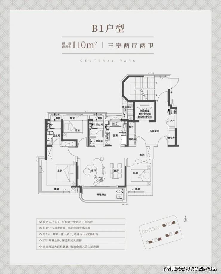 先来看建面约110㎡边套大横厅户型:约12.3米的超宽绰面宽几乎是堪比别墅产品了,这个视野和南向采光面相当出众。