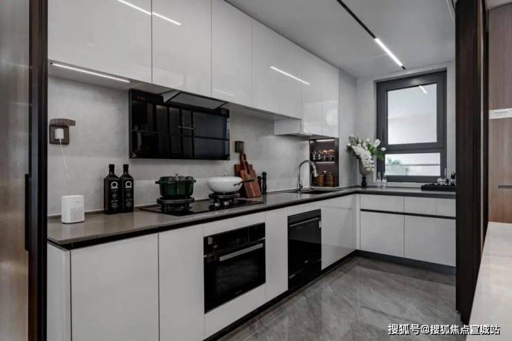 在每一个户型里,厨房皆配置高颜值玻璃移门,以集成铝板吊顶+LED嵌入式条形灯营造厨房顶部,飘窗处打造操作台与储物空间,高品质装修交付超薄镜面机身油烟机/防干烧燃气灶/洗碗机等品牌系列套装厨电,定制收纳橱柜/升降拉篮/谷物抽/多功能调味篮/碗碟拉篮/飘窗延伸平台等多重收纳组合还原整洁秩序,另有集成线性凉霸与末端净水器等考究设计,打造现代化美好厨房。