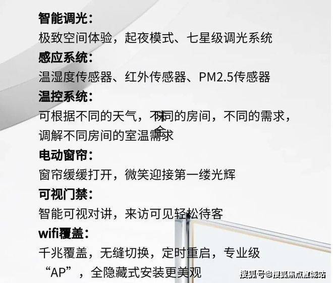 德国摩根·用科技创变生活智能调光:极致空间体验,起夜模式、七星级调光系统感应系统:温湿度传感器、红外传感器、PM2.5传感器温控系统:可根据不同的天气,不同的房间,不同的需求调解不同房间的室温需求电动窗帘:窗帘缓缓打开,微笑迎接第一缕光辉可视门禁:智能可视对讲,来访可见轻松待客wifi覆盖:千兆覆盖,无缝切换,定时重启,专业级“AP”,全隐藏式安装更美观