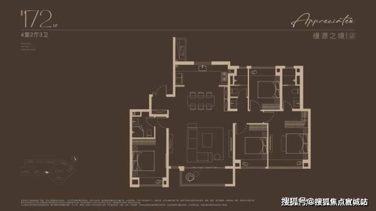 建面约172㎡4房户型,多娃家庭的进阶之选!奢阔尺度尽显家族气度!2梯2户,子母双开门礼序入户,私密尊崇门厅;约16米四开间朝南,搭配约6米尺度横厅,揽四时风景入怀。