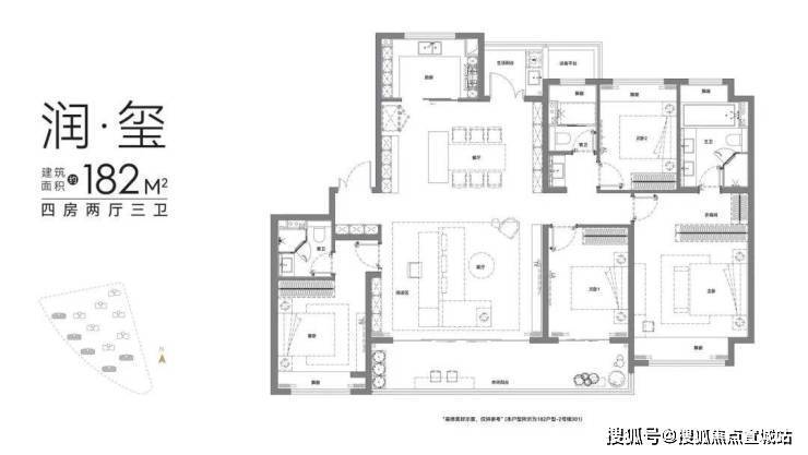 182㎡四室两厅三卫:得房率82%,南北通透,双主卧套房设计,总价约701-727万元
