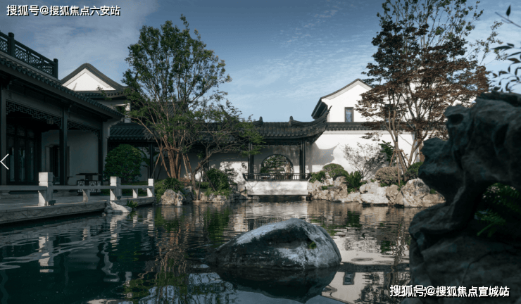 江南园林甲天下,苏州园林甲江南,比如像我们现在看到的园林布局,就是经典的苏州园林景观,讲究引水入园。造景围绕着这片水景展开,空间上比较有层次感。近景是流水、堆石,中景是连廊、假山,远景是中式合院的院墙、屋檐。