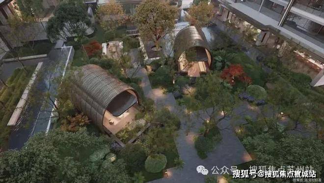 摩登江南园林:约5万方立体园林,融入乌篷船、苏绣等苏州文化符号,并选用西班牙珊瑚红奢石、百年古树等高端材质。