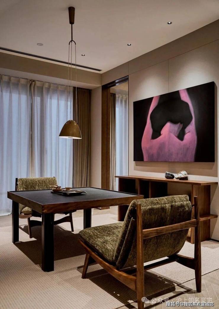 龙盛荟馆的接待处设计:空间讲究对称性、秩序感,暗绿纹哑光、温润的石材+仿铜金属板,调性和仪式感极佳,家具的选品又富有居家轻松氛围,有种俱乐部的感觉!