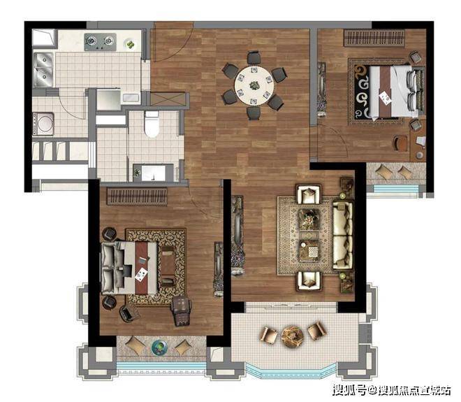 建面约95㎡2房,创新户型,全明设计。在一体化设计的客餐厨阳台中,一家人平时聚在其中,无论是坐在沙发上歇息、在厨房中烹饪、在饭桌上吃饭,窗外的风景都是生活的点缀。