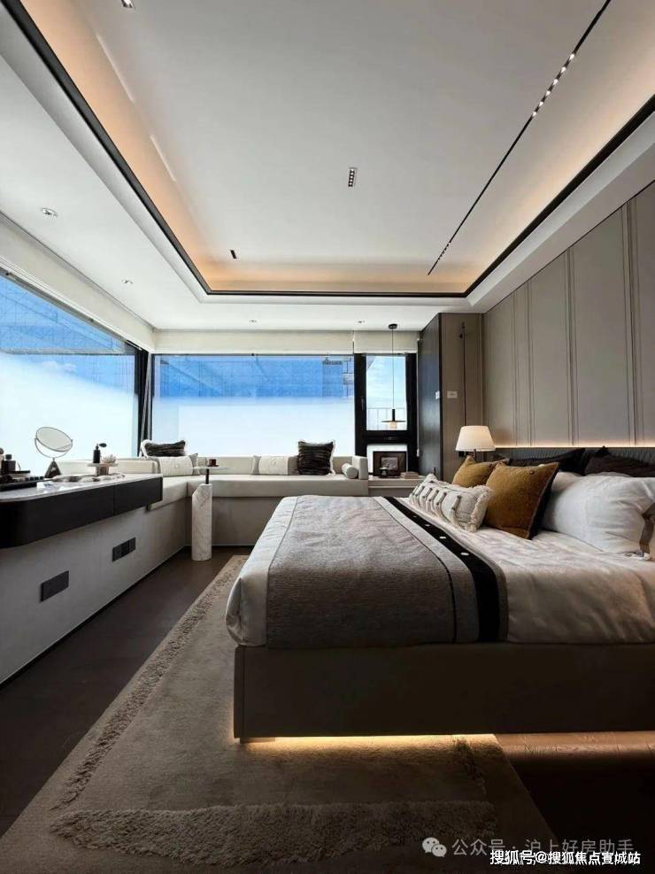 以整块奢岩破题,以皮革融入, 白金沙岩板、140户型采用 罗马白洞石岩板,主卧背景采用了车线工艺硬包,将豪宅标配升华为材质的史诗。