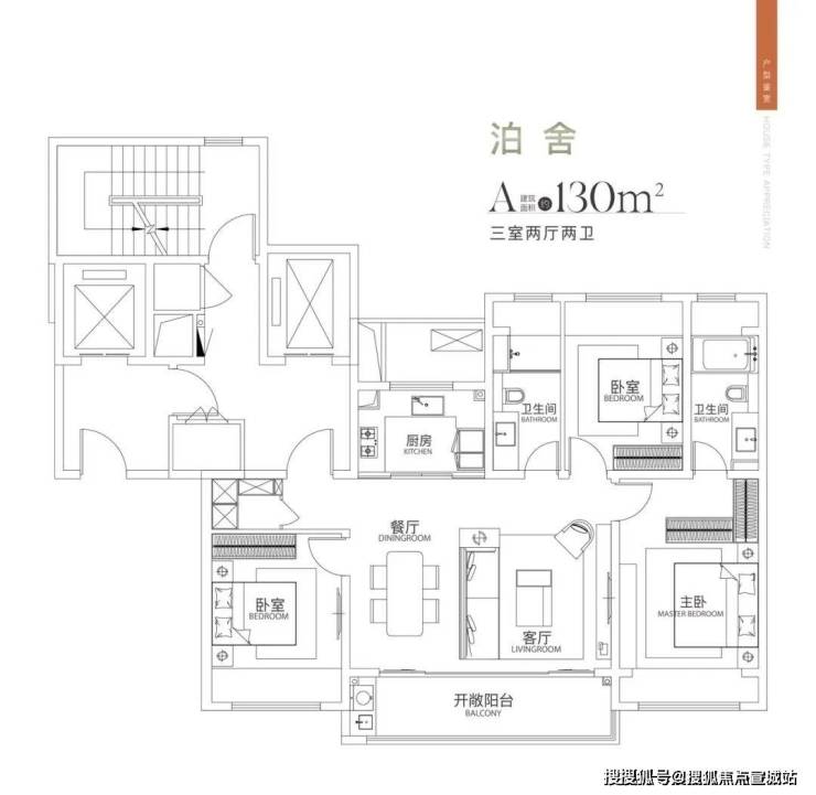 130户型是2梯2户设计,做的大三房。入户玄关储藏空间比较大,收纳充足。三开间朝南,朝南面宽13.2米,大横厅与阳台直接相连,开间6.4米。