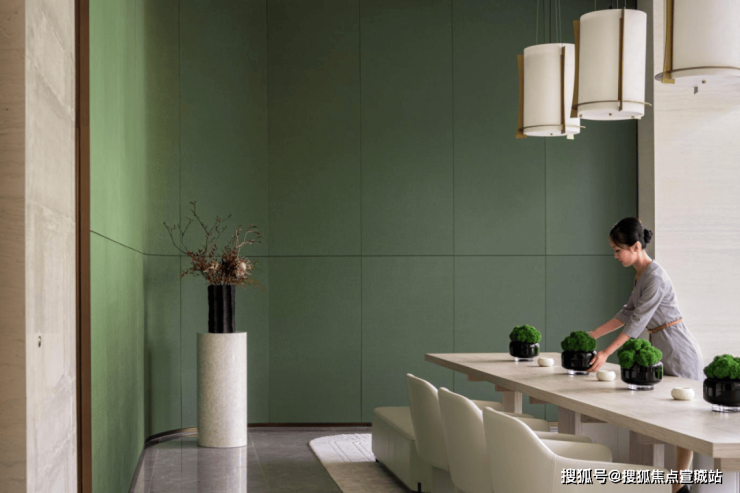 社区内部景观通过大面叠级水景为中心,搭配普拉达绿大理石和浪淘沙石材,奠定整体空间的高雅基调。