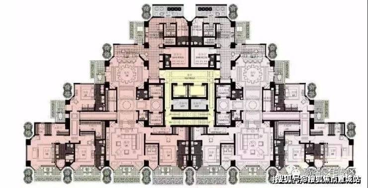 2号楼户型分布为一层4户,中间两套为375平米边套为680平米复式,总楼层39层,有两层为避难层,避难层会改造成绿化休闲区。