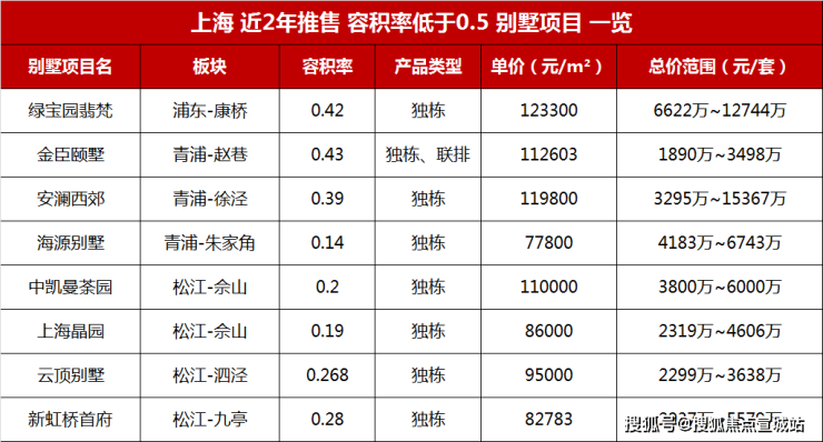 放眼全上海,目前容积率低于0.5的在售别墅盘,不超过10个,主力总价3000-6000万,个别房源总价高达1.5亿。