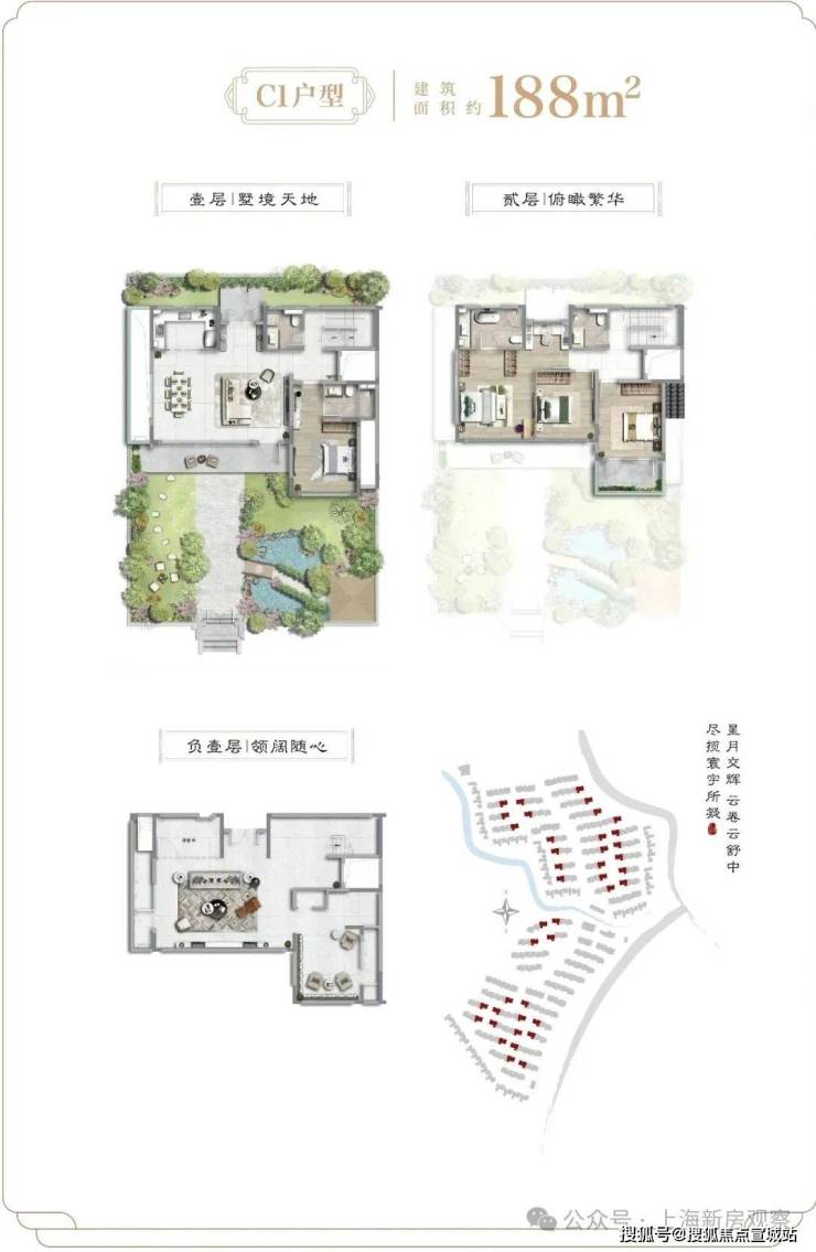 从户型设计上看:建面约138-188㎡联排与建面约211-214㎡院墅产品,庭前绿地,大面宽,地上仅2层,真正的低密宽境别墅,产品力断层式领先。