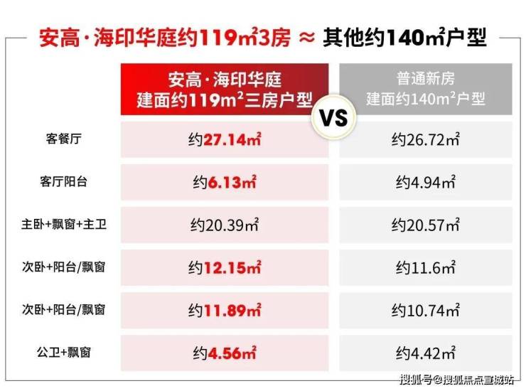 安高·海印华庭建面约119m²大三房的室内空间与常规新房建面约140m²左右的大三房相比,客餐厅、客厅阳台、两个次卧和公卫的空间都更大