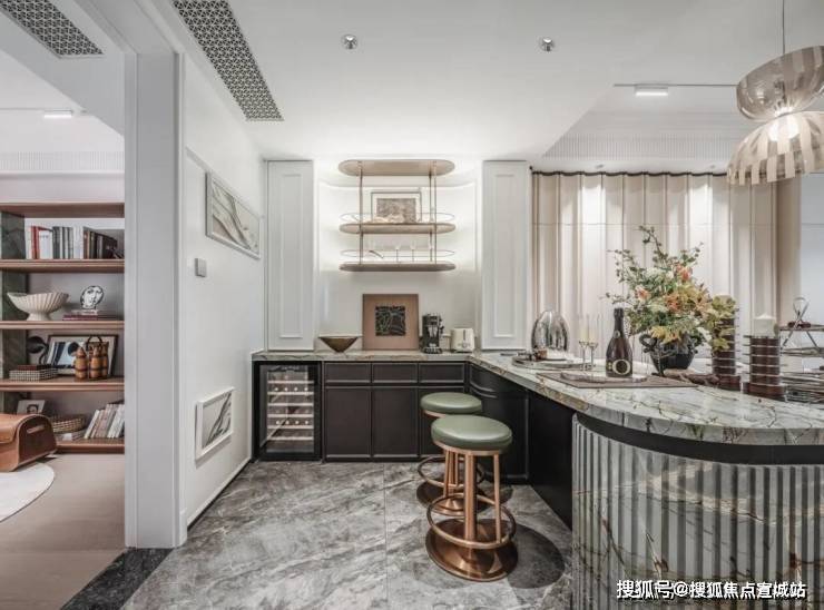 更好更奢的归家门庭,嘉佩乐酒店风格,海派元素充满空间的每一个角落,地面的复古花纹,金属镂空装饰墙,普拉达绿的奢石点缀,仿佛穿越到了摩登时代。