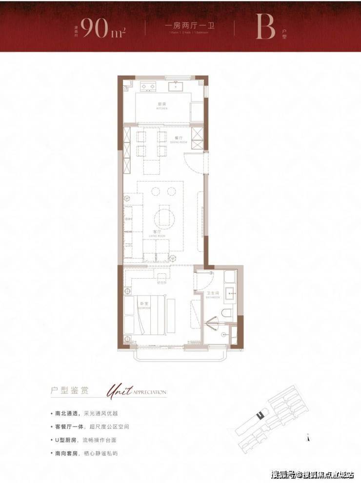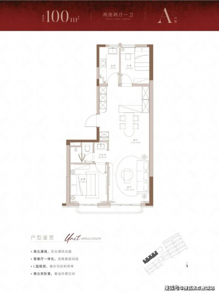 经典的 南北通透房型,卧室客厅采光皆丰沛, 一体化客餐厅带来的不仅是最便捷的烹饪动线,也为家庭成员之间的互动和交流日常提供了舒适空间,再加之 南北双卧设计,也保证了足够的温馨休息场地。