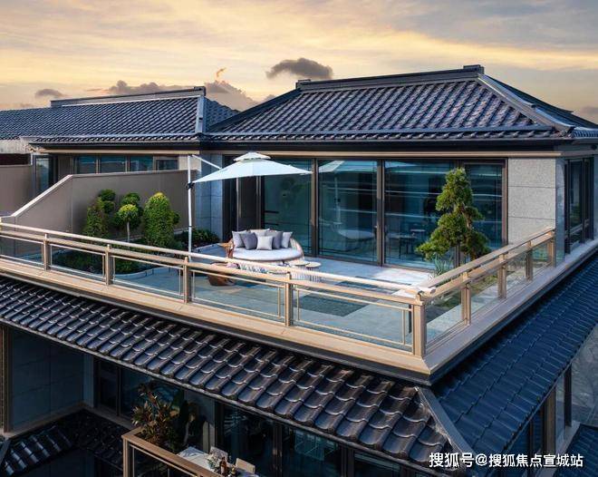 三重屋檐,代表天地人融合的东方宫殿最高等级,上檐、外檐、下檐三重结构,现代立面,以铝板、格栅、石材、瓦墙型材、玻璃等现代型材,彰显传世之宅的独特气度。