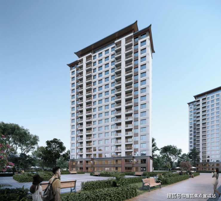 建筑单体:外立面风格为现代中式风格,外墙采用石材。
