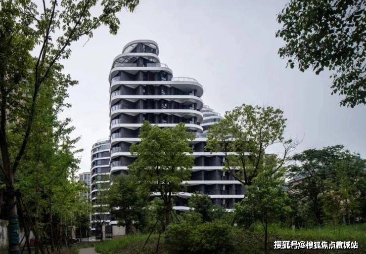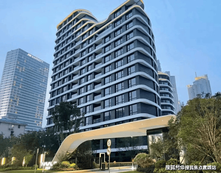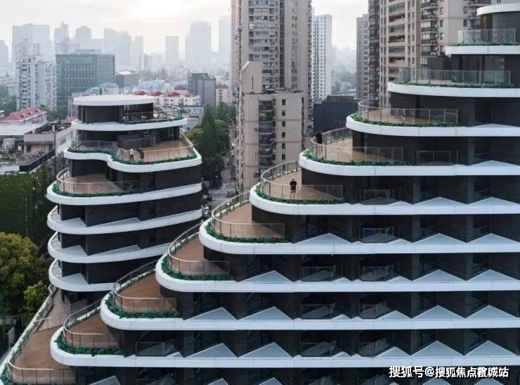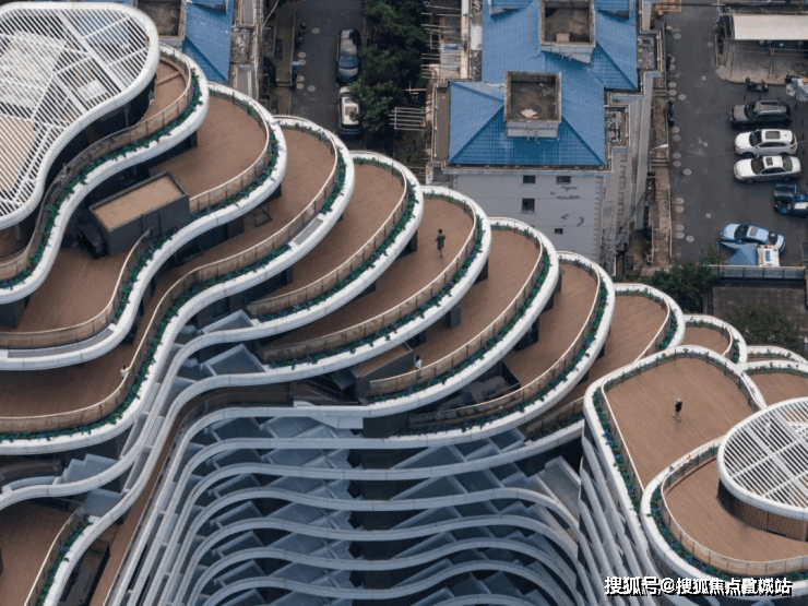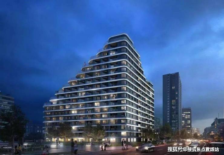 外立面采用玻璃幕墙现代简约风。建筑轮廓曲线蜿蜒,呈波浪线型层层迭高并后退,时尚感非常强。