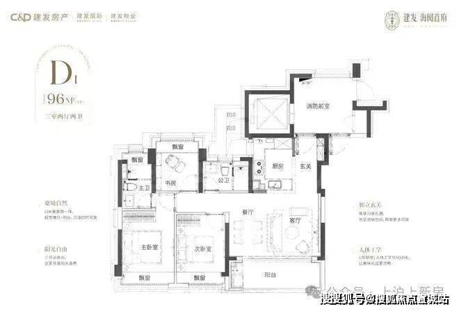 另一套建面约100㎡飞机户型,同样做了三房两卫,户型方正,几乎无过道设计,每一寸空间都没有浪费,舒适不局促。