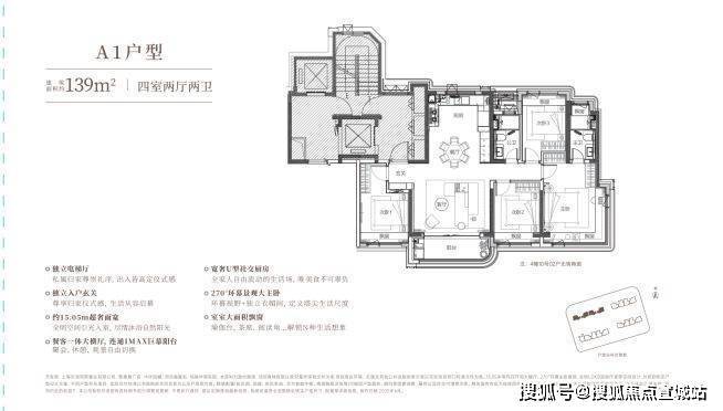 建面约 139㎡四房:四开间朝南,约 6.8 米巨幕阳台,餐厅可放下 8 人圆桌,主卧套房预留 L 型衣帽间,独立电梯厅入户,私密性好。