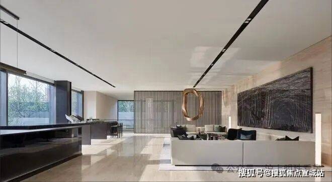 这客厅既是270°全景舱厅,无论全家在餐桌前欢聚一堂,还是孩子们在客厅嬉戏,一抬头便是以江景和城市为主题的巨幅油画。