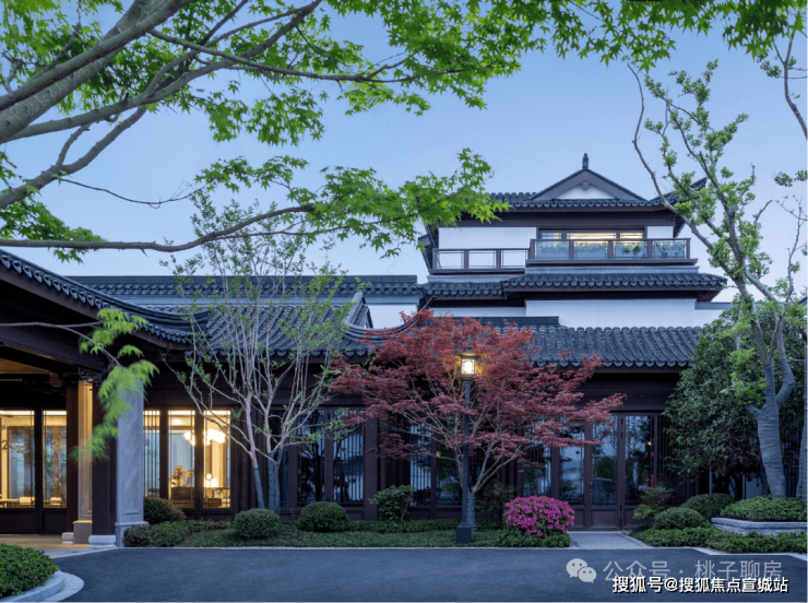建筑风格:采用宋式美学设计,外立面以白墙黛瓦为基调,搭配原木色格栅与青灰色石材,屋顶是舒缓的坡顶设计,檐角轻翘,还融入飞檐翘角、镂空花窗、铜制门环等传统元素,同时搭配大开面落地窗增强采光。