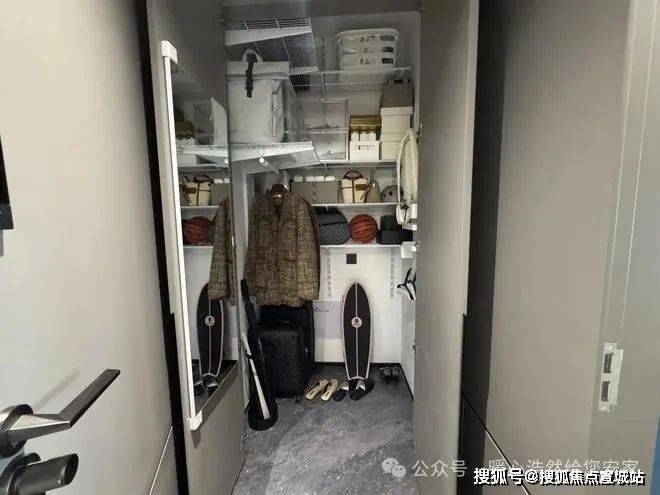 进门后左手边是一个800库,连衣冠镜都有,内部可以按自己需求做隔断,行李箱、球拍、鞋子以及各种杂物尽可往里放。这在百平以内的小户型中并不常见,大多因为空间有限,通常都只打个玄关柜。