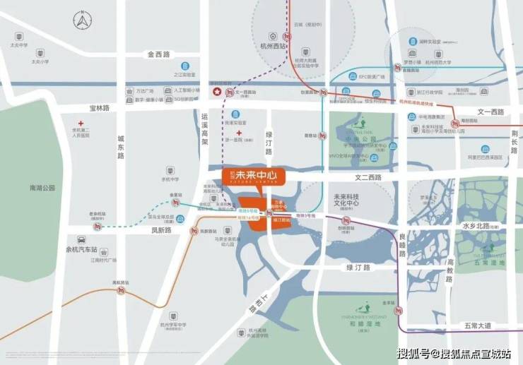 1.地处新晋杭州第三中心的未来科技城核心区块-地铁绿汀路站之上(3、5、16号线交汇)。