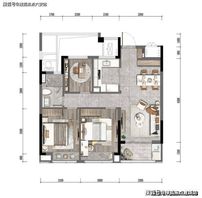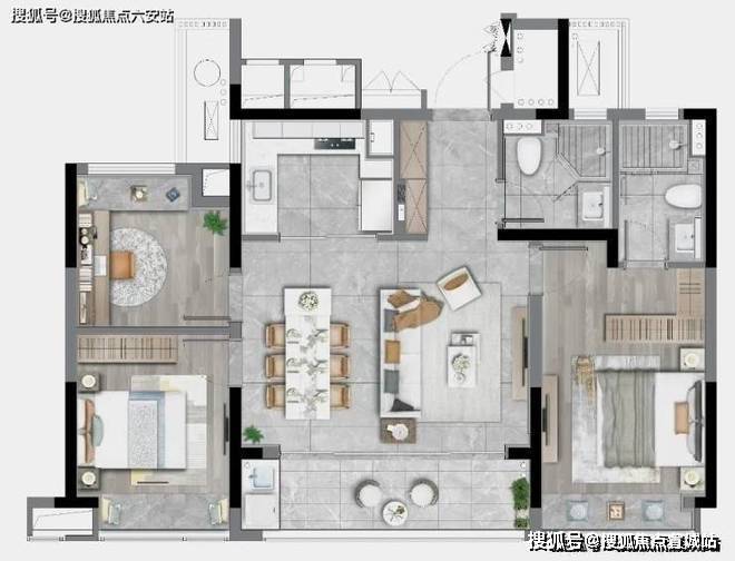 三卧朝南实现“阳光平权”,LDKG一体化公区+双阳台,兼顾景观与实用。