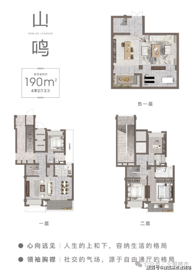 山水叠墅:建面约190-210㎡,4层立体空间,上层览景,下层拥院。