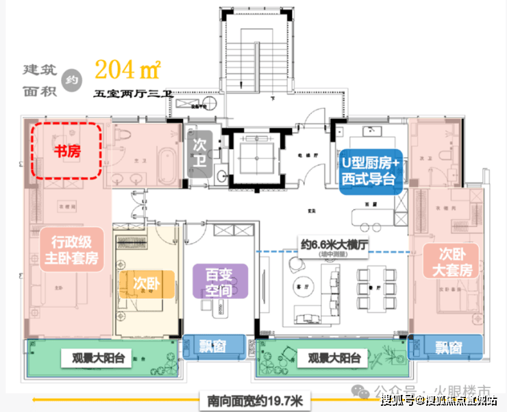 204㎡大平层,以五室两厅三卫布局,成就南向约19.7米、六开间朝南的奢阔尺度。客餐厅、主卧及三次卧全景一字排开,搭配2个约6.6米、270°环幕景观阳台,形成超广角视野。