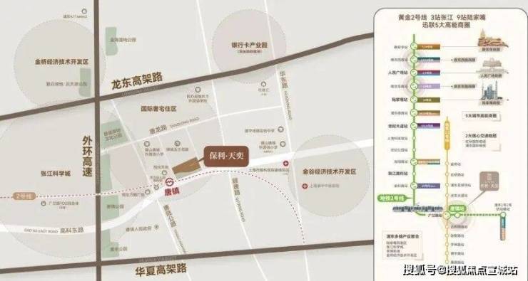 交通方面,该地块算是唐镇地铁上盖项目,与2号线唐镇站直线距离约200米,南侧紧贴着高科东路。通过2号线,2站金科路站,3站张江高科站,9站陆家嘴。