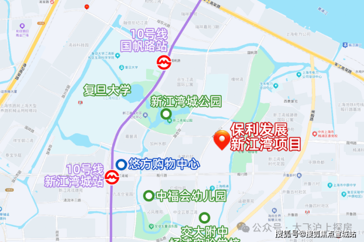 项目直线距离10号线新江湾城站约1.1公里,无需换乘可直达五角场、南京东路、豫园等各大商圈。