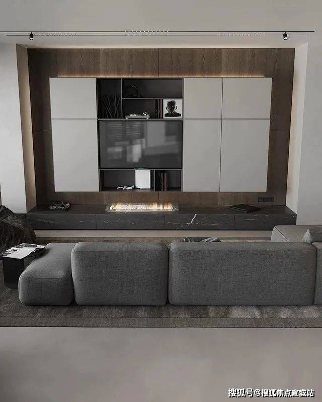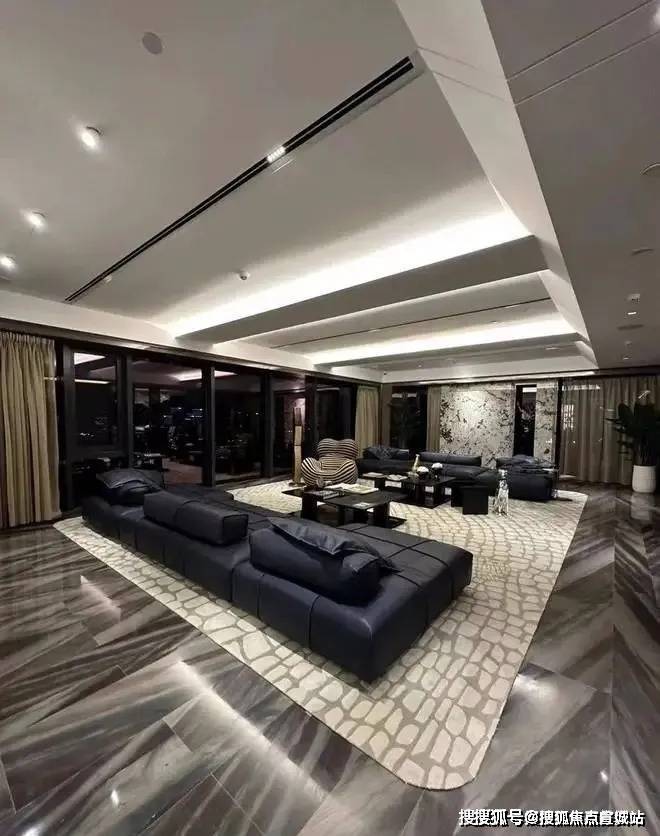 客厅的设计独具匠心,呈半圆形,开口处巧妙地连接了餐厅与厨房。深灰色的主色调在视觉上巧妙地扩展了空间感,使整个空间显得宽敞而舒适。灰色的组合沙发与墙面相呼应,营造出一种简约而优雅的氛围。百叶窗和线性台灯的设计同样充满了现代风格的艺术美学,将整个客厅装点得更加精致和时尚。