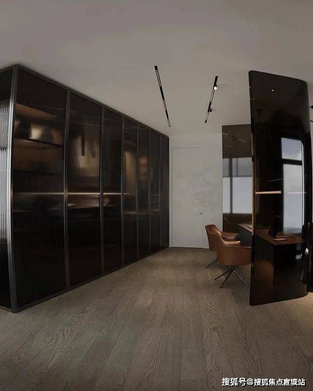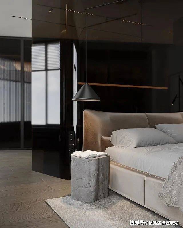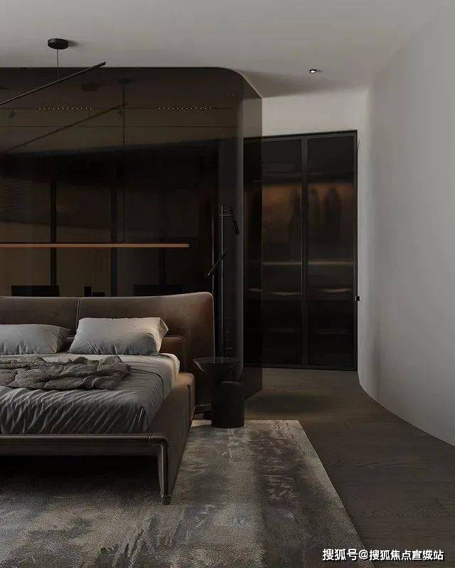 Thebedroomgivesprioritytowithdarktonal,dividethespacecleverlyforbedroomareaandcloakroomatthesametime.Thestainedglasspartitionseparatesthespacecleverly,andthenaturallightpenetratesthroughit,creatingamoreopenvisualeffect.Thewholespaceisfullofcomfortandwarmth,makingpeoplefeelthewarmthandtranquilityofhome.