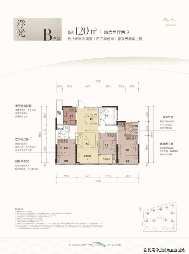 这款户型堪称四开间朝南的“流量王者”, 南向面宽约13米,双联阳台+双飘窗设计,视野和采光优秀; 套房主卧、双阳光次卧,颇有大平层的气势。